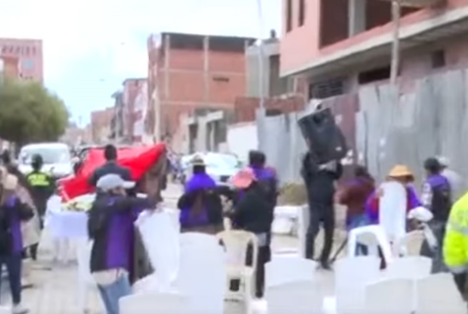 “Son siete movilidades que están destrozadas, han pateado, han roto los vidrios, aparte que nuestro sistema de sonido también lo han arrancado, no sabemos dónde están las carpas, porque nos han jalado todo de los banners, prácticamente hemos sido arrolladas por estos señores”, denunció la representante de Cemupe, Julia Quispe.