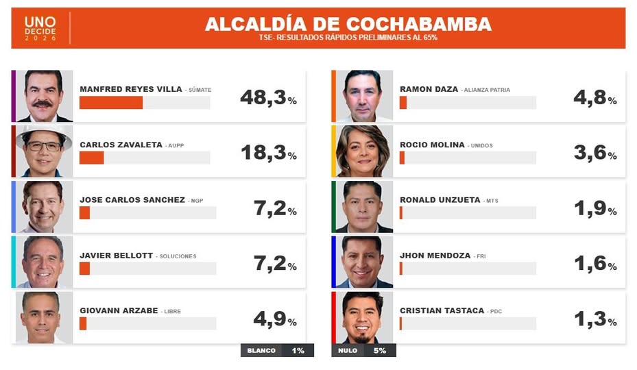 El candidato de Súmate, Manfred Reyes Villa, se perfila como ganador de las elecciones subnacionales 2026 en el municipio de Cochabamba, consolidando ...